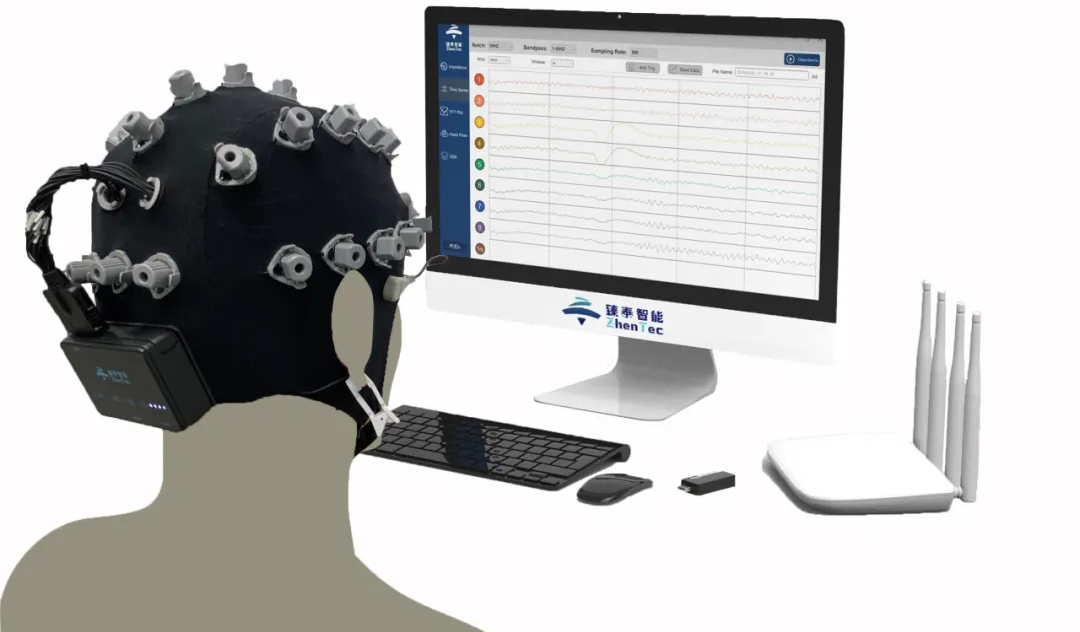 西安臻泰智能科技有限公司孵化的產(chǎn)品——無線多通道腦電采集分析系統(tǒng)是國(guó)內(nèi)首款無線全兼容腦電采集分析系統(tǒng)。其通過腦電電極采集人體uV級(jí)腦電信號(hào),進(jìn)行放大器處理、數(shù)模轉(zhuǎn)換后,通過5GHz的WIFI通信發(fā)送到電腦端,并以此控制外部機(jī)器人,形成腦-機(jī)接口系統(tǒng)。