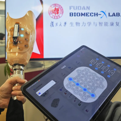 復(fù)旦大學(xué)生物力學(xué)與智能康復(fù)工程實(shí)驗(yàn)室則基于生物力學(xué)技術(shù)孵化出了連接著一整套智能觸覺仿生系統(tǒng)的智能假肢,該假肢可為佩戴者提供有效的落地指引和感覺反饋,可讓佩戴者感受到假肢是自身身體的一部分,從而實(shí)現(xiàn)真正的人機(jī)協(xié)調(diào)統(tǒng)一。同時(shí),該團(tuán)隊(duì)開發(fā)的柔性高、可拉伸強(qiáng)的可穿戴感覺反饋“貼片”,即觸覺仿生系統(tǒng),上面的傳感器可實(shí)時(shí)傳遞人體力覺信息,可為患者康復(fù)訓(xùn)練提供實(shí)時(shí)數(shù)據(jù),方便及時(shí)調(diào)整康復(fù)訓(xùn)練計(jì)劃。