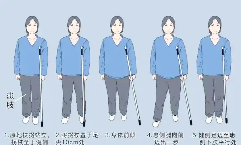 單拐步行技巧:將拐杖置于健側(cè),步行時應(yīng)遵循以下順序:先伸出拐杖,緊接著邁出患側(cè)腿,最后健側(cè)腿跟上,以保持平衡。雙拐步行技巧:在步行時,首先將雙拐與患肢同時伸出,然后緊跟健側(cè)腿的邁出,以維持身體的平衡。請注意,患肢在此過程中需承擔(dān)部分體重。