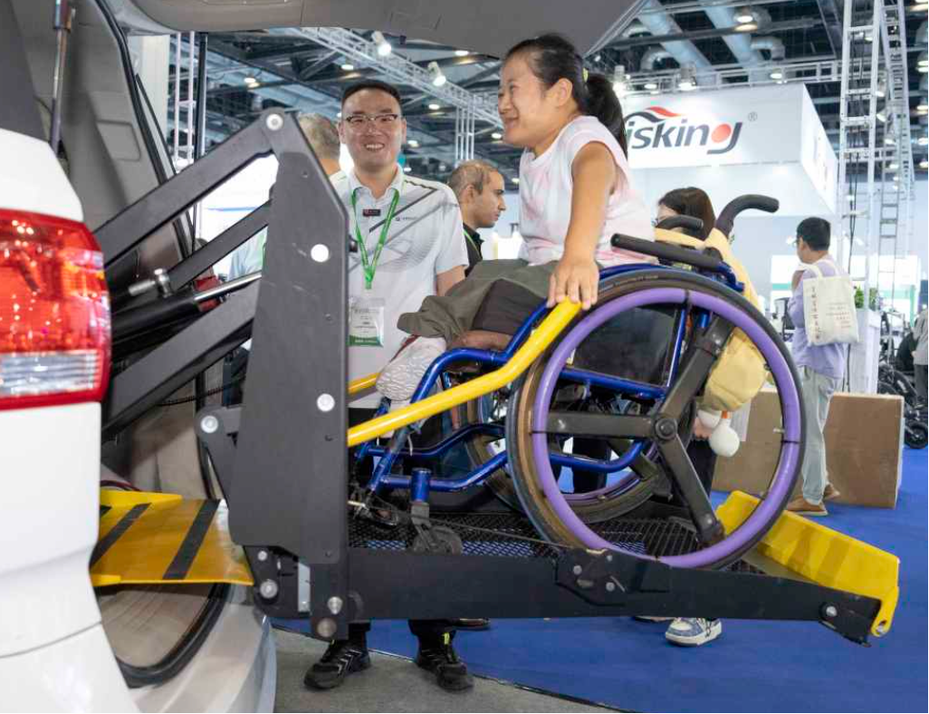 參觀者在明澳科技展臺體驗(yàn)尾門式升降機(jī)。新華社記者 才揚(yáng) 攝這里不僅是科技創(chuàng)新產(chǎn)品的展臺,更是希望的“窗口”。它讓無聲的困境被聽見,讓具體的需求被看見。