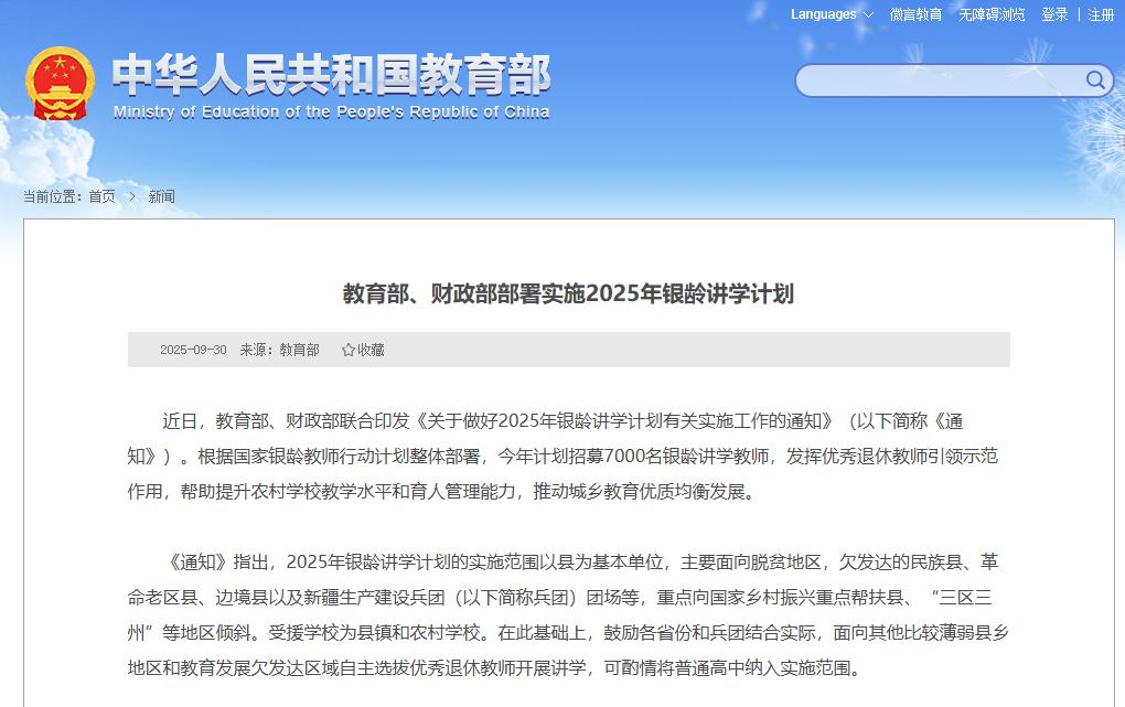 近日,教育部、財政部聯(lián)合印發(fā)《關于做好2025年銀齡講學計劃有關實施工作的通知》。根據(jù)國家銀齡教師行動計劃整體部署,今年計劃招募7000名銀齡講學教師,發(fā)揮優(yōu)秀退休教師引領示范作用,幫助提升農(nóng)村學校教學水平和育人管理能力,推動城鄉(xiāng)教育優(yōu)質(zhì)均衡發(fā)展?!锻ㄖ访鞔_,申請銀齡講學計劃的退休教師以校長、教研員、特級教師、骨干教師為主,年齡一般在65歲(含)以下等等。