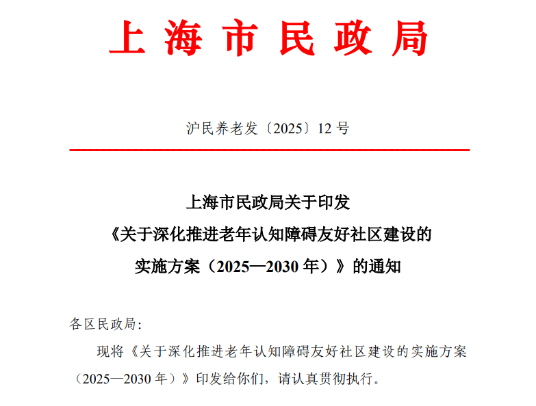 上海市民政局印發(fā)《關于深化推進老年認知障礙友好社區(qū)建設的實施方案(2025—2030年)》的通知,內(nèi)容包括加快健全三級老年認知障礙支持網(wǎng)絡、完善全鏈條老年認知障礙服務體系、加強老年認知障礙友好氛圍營造等方面。到2030年實現(xiàn)上海市全市老年認知障礙社區(qū)干預機制全面有效建立,認知障礙老年人及其家庭在社區(qū)普遍能便捷獲得支持關愛,老年認知障礙友好城市基本建成。60周歲以上老年人及其家庭對認知障礙友好社區(qū)項目以及認知障礙科普知識的知曉率達到80%等。
