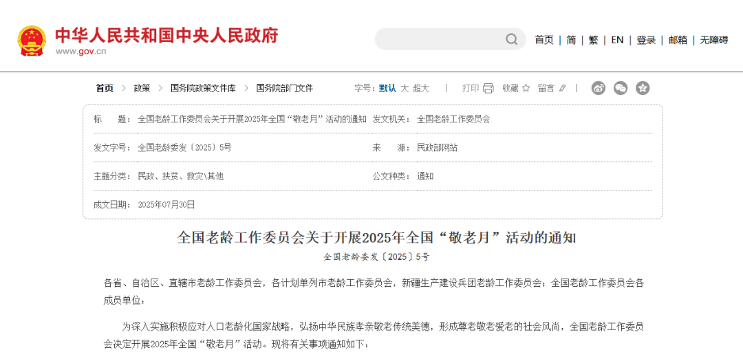 近日,全國老齡工作委員會印發(fā)通知,啟動2025年全國“敬老月”活動,主題為“弘揚孝親敬老美德,共建老年友好社會”,活動時間為2025年10月10日至31日,活動內(nèi)容包括開展人口老齡化國情教育活動、開展走訪慰問和關愛幫扶老年人活動、開展老年用品和服務項目宣傳推廣活動、開展老年人健康促進活動、開展老年人精神文化生活提升活動以及開展老年人權益保障法治護航活動等。