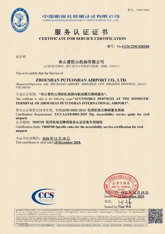 近日,舟山普陀山國際機(jī)場(chǎng)通過民用機(jī)場(chǎng)無障礙服務(wù)認(rèn)證,成為全國首家獲此認(rèn)證的機(jī)場(chǎng)。該認(rèn)證依據(jù)《民用機(jī)場(chǎng)無障礙服務(wù)指南》標(biāo)準(zhǔn),對(duì)國內(nèi)航站樓無障礙服務(wù)進(jìn)行專業(yè)評(píng)估。