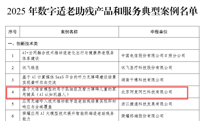 1月21日,國(guó)家工業(yè)和信息化部正式公布2025年數(shù)字適老助殘產(chǎn)品和服務(wù)典型案例名單,北京阿叟阿巴科技有限公司(ALSOLIFE)自主研發(fā)的“基于大語言模型的用于孤獨(dú)癥及智力障礙兒童的家用輔具(AI認(rèn)知機(jī)器人)”成功入選!