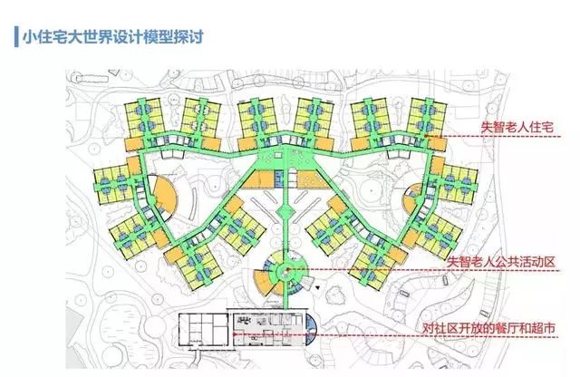 針對不同類型的老人,需要有不同的設(shè)計策略,不能把不同類型的失智老人混在一起,禪修型的需要一個安靜的角落,而浪人型則需要足夠的活動空間。荷蘭對失智癥老人的心理特征、需求的研究已經(jīng)形成了一套非常有特色的失智癥照護模式和設(shè)計模型,我們把這個模型叫做“小住宅,大世界”,老人們以6~8人為一個單元,共用一個大起居室。不同健康狀況的老人,活動范圍分為三個級別:病情重的只能在自己的單元里活動,狀況稍好的可以到別的單元里串門,級別最高的可以到達(dá)對外的公共餐廳和超市等區(qū)域,但不能走出養(yǎng)老院。