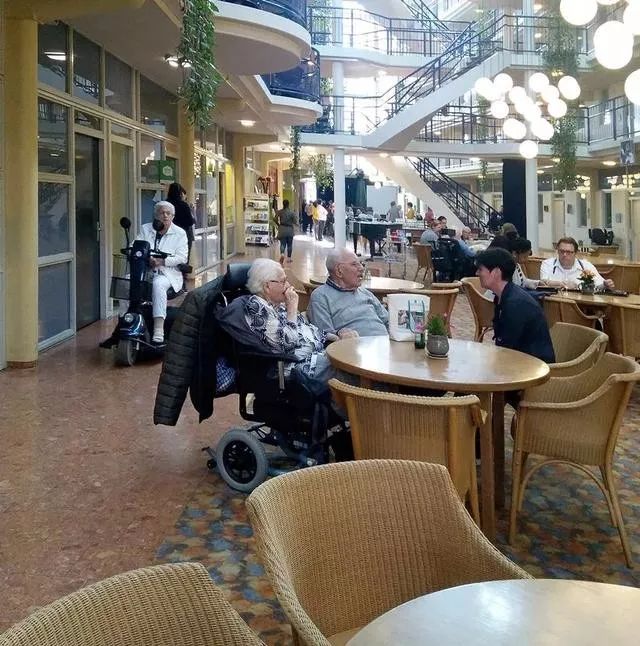 荷蘭的養(yǎng)老機構(gòu)中除長期照護的養(yǎng)老院之外,還有一種主要類型就是針對可自理老人的生活支持型的養(yǎng)老公寓。這種機構(gòu)一般會向老人提供包括餐飲、保潔、娛樂以及陪護等服務(wù),并與醫(yī)院、居家護理機構(gòu)保持緊密聯(lián)系,以中國人耳熟能詳?shù)?ldquo;荷蘭生命公寓”為代表。荷蘭生命公寓的建筑通常有個很大的特點,就是公寓的建筑圍合出一個很大的采光中庭,擁有體量很大的共享空間,里面各種活動非常豐富,并對周邊社區(qū)開放。