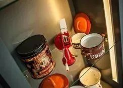 上圖是義工們用各種織物拼貼的一件陳設(shè)品,鍛煉老人的觸覺。下圖是養(yǎng)老院公共走廊里的一些康復(fù)訓(xùn)練的設(shè)計。一些老物件的陳設(shè),比如上圖的罐子,里面裝的東西類似于我們80年代的麥乳精,是老人們熟悉的物品。