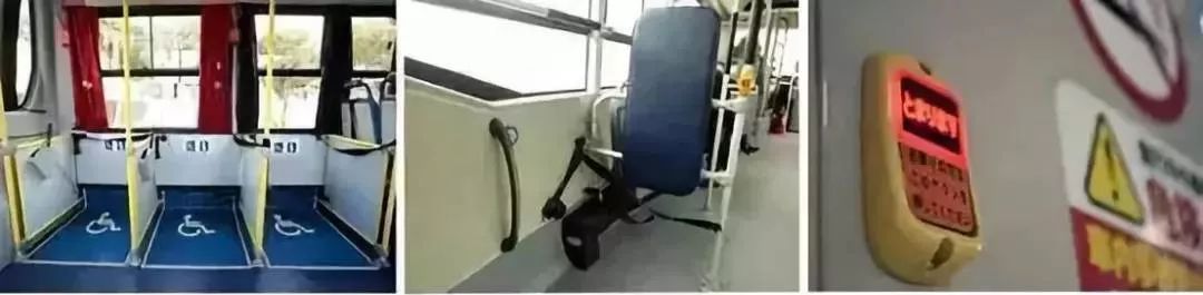 公交車內(nèi)還設(shè)有可折疊的殘疾人專用座位和固定輪椅用的皮帶,以及用于殘障人士向司機呼叫或告知下車的專用按鈕。