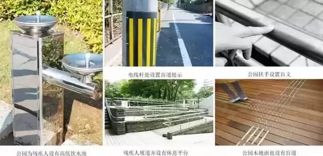 公園的無障礙設(shè)計重點在盲道、無障礙衛(wèi)生間、坡道、座椅、飲水池等。