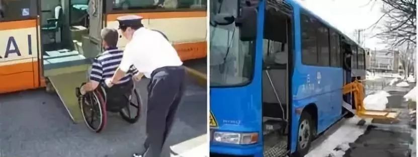 日本的公交車在車門處設(shè)置了像抽屜一樣的專用坡道,使用時司機將坡道抽出并根據(jù)需要調(diào)節(jié)坡度,方便使用輪椅的殘疾人乘坐公交車。
