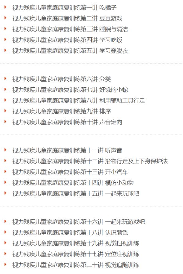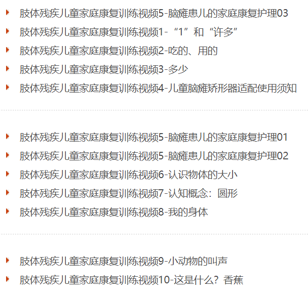 視頻包括視力、聽力、肢體、智力殘疾兒童和孤獨(dú)癥兒童康復(fù)訓(xùn)練內(nèi)容,由中央彩票公益金資助拍攝。