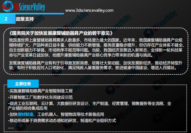 隨著市場對醫(yī)療器具的需求不斷攀升,3D打印以其“增材制造”的優(yōu)勢,在醫(yī)療器具的研發(fā)生產(chǎn)上贏得了國家在政策上的支持:在2018年國家康復(fù)輔具研究中心牽頭申報的“仿生假肢手感知與控制的神經(jīng)信息解析和交互技術(shù)研究”以及“假肢矯形器的個性化設(shè)計(jì)與增材制造應(yīng)用示范”兩項(xiàng)項(xiàng)目均獲批立項(xiàng),中央財政資助經(jīng)費(fèi)分別為2380萬元和931萬元。