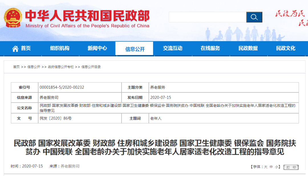 7月15日,民政部、財(cái)政部、中國殘聯(lián)等九部門聯(lián)合發(fā)布《關(guān)于加快實(shí)施老年人居家適老化改造工程的指導(dǎo)意見》,提出: